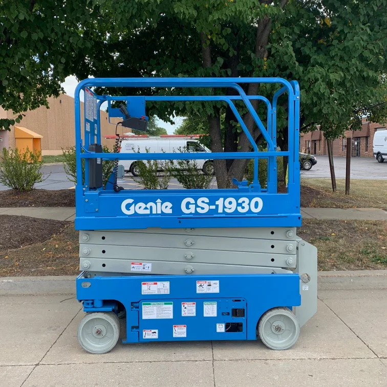 The Genie GS1930 is a popular 19-foot electric scissor lift designed for indoor environments where space is limited and maneuverability is essential. Its compact size makes it well suited for contractors and facilities working in narrow aisles and confined interior areas.